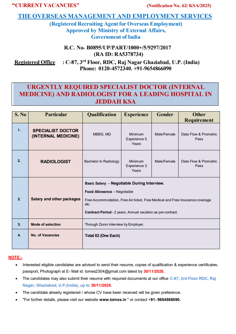 URGENTLY REQUIRED SPECIALIST DOCTOR (INTERNAL MEDICINE) AND RADIOLOGIST FOR A LEADING HOSPITAL IN JEDDAH KSA